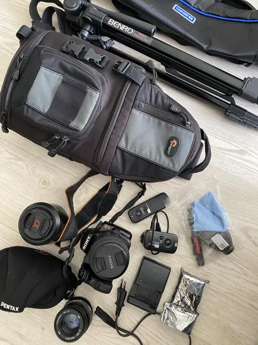 Полный набор со всем необходимым фотографу для съемки людей и пейзажей. В комплекте: • камера Sony A37 с объективом 3.5-5.6/18-55 SAM и 3 аккумуляторами, зарядное устройство на один аккумулятор • объектив Sony SAL-55200-2 DT 4-5.6/55-200 SAM для съемки отдаленных объектов, в карусели есть пример фото • объектив Гелиос 44-3 с переходником для крепления (с чипом), подходит для портретов, красиво размывает фон • устройство удаленного контроля доя съемки с пульта • штатив BENRO T600EX 47-146 см, легкий и удобный в использовании; • маленькая сумка Pentax и фоторюкзак Lowepro SlingShot 102 AW с 3 отделениями под камеру/объективы и множеством мелких, продуманных отделений • набор для чистки объективов.