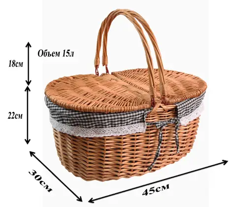 Корзина плетеная из натуральной, цельной лозы. Очень прочная. Ручка складная, удобно при перевозке. Внутри обшита материалом для удобства и безопасности (исключает повреждение рук о кончики лозы). ГАРАНТИЯ: КАЧЕСТВА, РАЗМЕРА, ОБЪЕМА. Будет не заменима для пикника на любой даче, в доме и даже в квартире. Удобна и практична в лесу, саду и огороде. Также можно хранить фрукты, овощи и другие предметы или использовать в качестве декора.