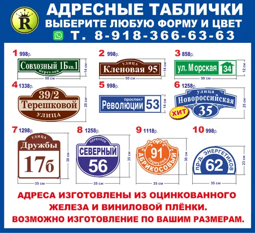 Изготовление широкого ассортимента адресных и информационных табличек на дома из высококачественной оцинковки с покрытием пленкой ORACAL. Мы предлагаем долговечные и эстетичные решения для обозначения домов, офисов и предприятий. Наши таблички прослужат многие годы, сохраняя яркость и насыщенность цветов, несмотря на воздействие солнечных лучей, дождя и снега. Наши преимущества: 1. Высокое качество материалов: используем только оцинкованную сталь, устойчивую к коррозии и механическим повреждениям. 2. Широкий выбор дизайнов: предлагаем как готовые решения, так и разработку индивидуального дизайна с учетом ваших пожеланий и особенностей фасада здания. 3. Оперативное изготовление: благодаря собственному производству, мы можем изготовить адресные таблички в короткие сроки без ущерба качеству. Обычно 3-5 рабочих дней. 4. Доступные цены: предлагаем выгодные условия сотрудничества и скидки для постоянных клиентов и оптовых покупателей. 5. Быстрая и удобная доставка: отправляем заказы по всей стране надежными транспортными компаниями. Закажите адресные таблички у нас и обеспечьте себе и своим клиентам удобство навигации и стильный вид вашего здания!