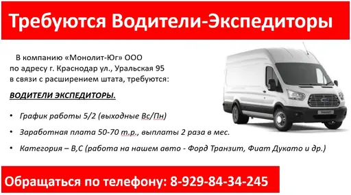 Обязанности: —доставка заявок по торговым точкам согласно маршруту —работа с накладными —соблюдать контроль чистоты служебного авто, уровня охлаждающей жидкости, масла и т.д — правильное оформление путевых листов (всему научим) Требования: — ответственность — пунктуальность Условия: — выходные вс, пн. — время погрузки с 7 до 9 утра — оклад + % + мотивация О компании: — табачная компания ООО МОНОЛИТ-ЮГ