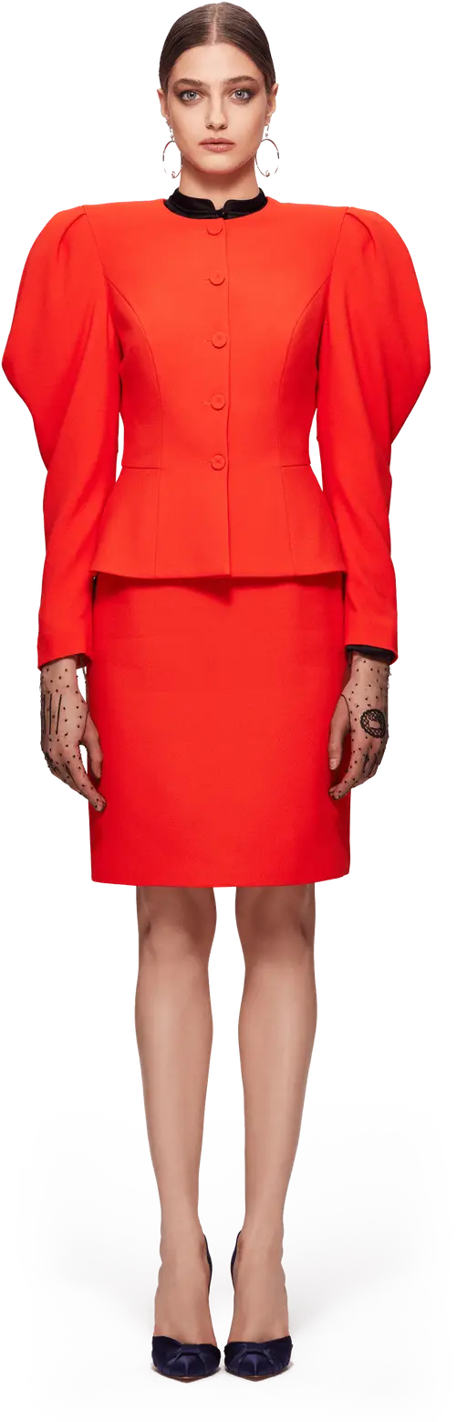 Жакет из красного крепа. Подкладка из атласа в полоску с авторским принтом. Длинные рукава-фонарики, зауженные книзу. Приталенный силуэт с баской. Застежка на пуговицы. Рост модели 180 см, на модели — размер 36 FR. Только сухая чистка. Сделано в России.