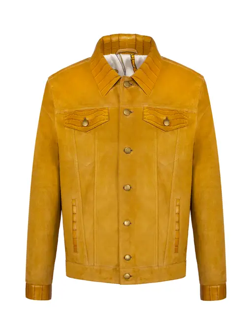Стильная куртка из коллекции 2022 выполнена из замши и дополнена вставками из кожи нильского крокодила. Элегантную модель дополняют отложной воротник, так же выполненный из кожи крокодила и два кармана с клапанами на груди. Шёлковая подкладка создаёт особый комфорт, а актуальный образ завершает фурнитура Bardini, которая прекрасно сочетается с лаконичным фасоном. Изделие служит примером безупречного дизайна и функциональности.