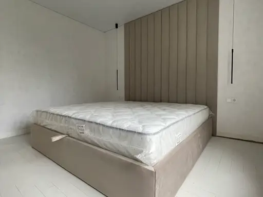 Мягкая стеновая панель сделанная по индивидуальному дизайну предоставленному нашим клиентом. Проект выполнен в высокоплотном велюре. Изголовье включает в себя пышные и объемные полосы Спальный короб размером 1800х2000, с подъемным механизмом и вместительным бельевым коробом.